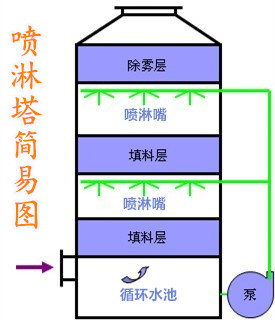 上圖一張廢氣處理流程圖,主要設(shè)備包括玻璃鋼離心風(fēng)機(jī)、廢氣凈化塔以及管道、泵等配件。其中風(fēng)機(jī)、管道、泵、加藥箱、循環(huán)水箱等配件是廢氣處理工程中所比不可少的設(shè)備,也是出了廢氣凈化塔之外的主要設(shè)備。而玻璃鋼酸霧凈化塔的結(jié)構(gòu),以下幾部分是必不可少的: