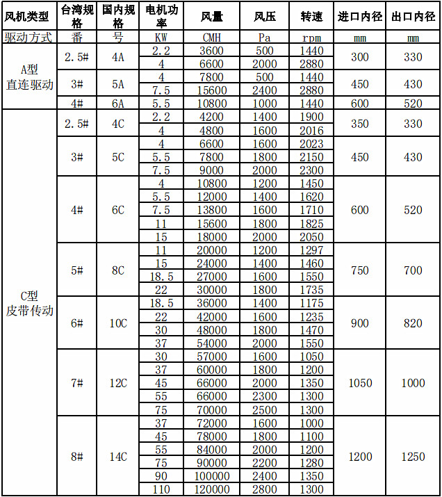 本公司生產(chǎn)的風(fēng)機(jī)引進(jìn)的技術(shù)為臺(tái)灣生產(chǎn),在臺(tái)灣風(fēng)機(jī)的型號(hào)大小稱作番,代表字母是#,但是在國內(nèi)統(tǒng)稱為號(hào),用A或C代表。