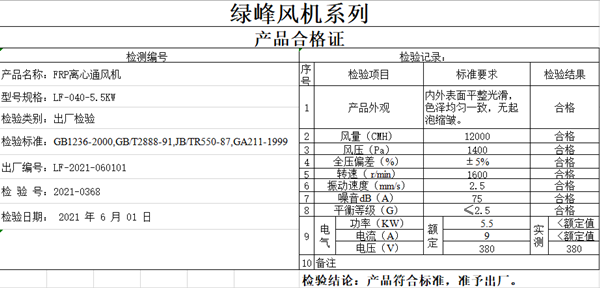 上面介紹的就是常規(guī)風(fēng)機(jī)合格證上面所記載的內(nèi)容,如果風(fēng)機(jī)為特殊類型在合格證上還需要加上一些特殊的檢測項目。如玻璃鋼阻燃風(fēng)機(jī),在檢測項目中需要加上阻燃性能測試。