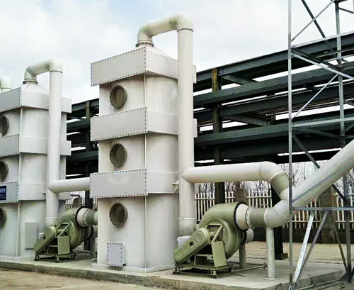 比如在電鍍廠使用的玻璃鋼凈化塔,其主要的作用是除去氣體中的酸性成分。在工作時,在塔內(nèi)循環(huán)噴淋堿性吸收液,與含酸性成分的氣體發(fā)生中和反應(yīng)從而達(dá)到除去酸性成分的目的。