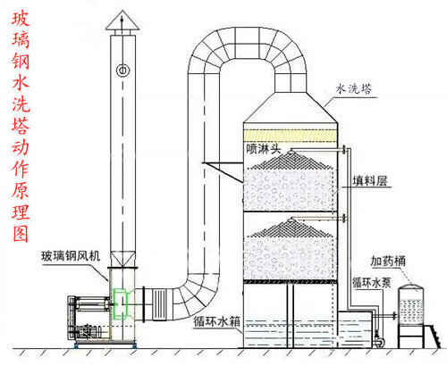 洗滌塔即將廢氣中的雜質(zhì)清除,以煤炭燃燒廢氣處理為例,首先,廢氣有管道進入塔體底部,與由上至下的噴淋液體進行充分接觸,將廢氣中含有的灰塵過濾掉,流入底部的水槽內(nèi),氣體繼續(xù)往上走,根據(jù)廢氣量的大小選擇處理的次數(shù),經(jīng)過隔離層與形成膜狀的液體繼續(xù)清洗,如此反復(fù),直至進入塔體頂部的除霧層,將氣體中含有的水分過濾之后,有管道經(jīng)由玻璃鋼離心式風(fēng)機排出。