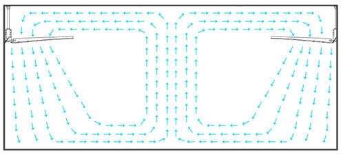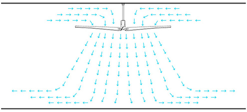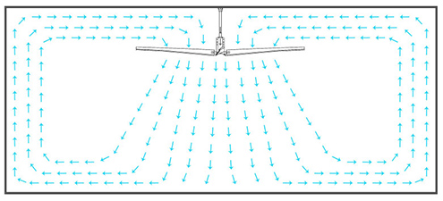 至遇到側(cè)墻、龐大障礙物或其他水平氣流向上推動到屋面,從而全方位、多角度、無死角強化空氣循環(huán)流通,消除溫度分層。