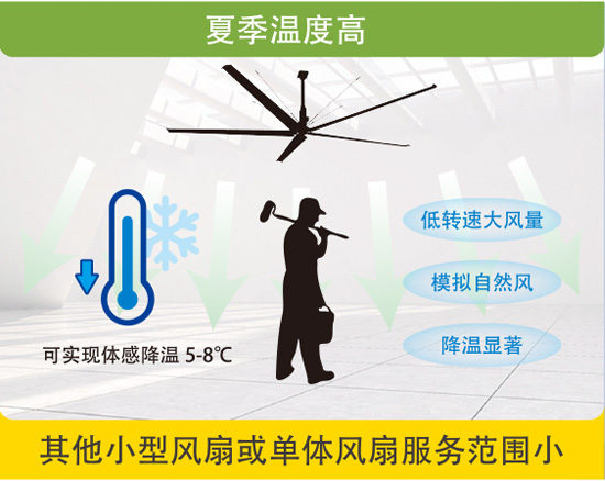 夏季體感溫度上升,小型風(fēng)扇或其他單體降溫設(shè)備服務(wù)范圍小。大王工業(yè)大風(fēng)扇低轉(zhuǎn)速大風(fēng)量,模擬 2-3 級自然風(fēng)持續(xù)吹拂,可實現(xiàn)體感降溫 5-8°C,提升環(huán)境質(zhì) 量及人體舒適度