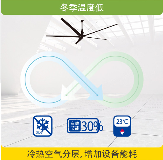 冬季很多大型場所使用空調(diào)等采暖設(shè)備,由于暖空氣持續(xù)上升,在空間內(nèi)形成氣流分層,導(dǎo)致頂部溫度較高,而下方人員依然感覺寒冷。使用大王節(jié)能大風(fēng)扇,可將上下氣流充分?jǐn)噭?,實現(xiàn)上下溫度均衡,減少設(shè)備供暖時間,有效節(jié)省 30% 供暖能耗。