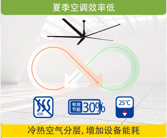 部分空間在空調(diào)設(shè)備運轉(zhuǎn) 的情況下,由于冷熱空氣分層,導(dǎo)致空間內(nèi)冷熱不均, 增加設(shè)備能耗。使用大王節(jié) 能大風(fēng)扇,加速內(nèi)部空氣對流,消除空氣分層,空調(diào)溫度可提高 2-3°C,實現(xiàn)省電30% 以上