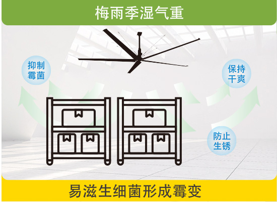 梅雨季節(jié)雨水多,濕氣重且早晚溫差大,物體表面容易產(chǎn)生凝露,易滋生細(xì)菌形成 霉變,更有加速金屬表面氧 化生銹現(xiàn)象,使用大王節(jié)能大吊扇,加速空氣流通,有效抑制霉菌,保持室內(nèi)干爽、防止貨物生銹、霉變